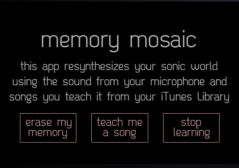 This application is motivated by my interests in experiencing an Augmented Perception and of course very much inspired by some of the work here at Goldsmiths. The application of existing approaches in soundspotting/mosaicing to a real-time stream and situated in the real-world allows one to play with their own sonic memories, and certainly requires an open ear for new experiences. Succinctly, the app records segments of sounds in real-time using it’s own listening model, as you walk around in different environment (or sit at your desk). These segments are constantly built up the longer the app is left running to form a database (working memory model) for which to understand new sounds. Incoming sounds are then matched to this database and the closest matching sound is played instead. What you get is a polyphony of sound memories triggered by the incoming feed of audio, and an app which sounds more like your environment the longer it is left to run. A sort of gimmicky feature of this app is the ability to learn a song from your … Continue reading...