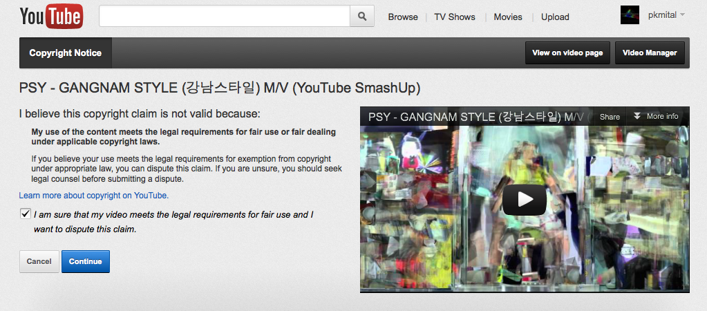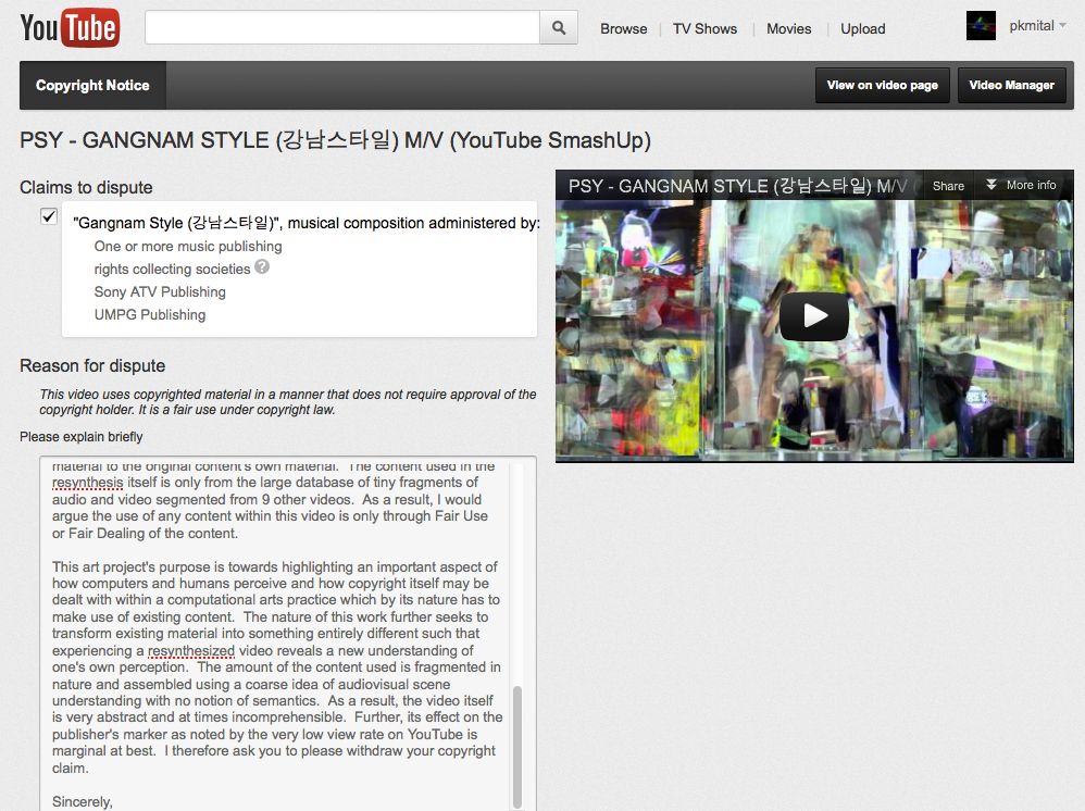 I ask you to please withdraw your copyright violation notice on my video, “PSY – GANGNAM STYLE (?????) M/V (YouTube SmashUp)” as I believe my use of any copyrighted material is protected under Fair Use or Fair Dealing. This video was created by an automated process as part of an art project developed during my PhD at Goldsmiths, University of London: http://archive.pkmital.com/projects/visual-smash-up/ and http://archive.pkmital.com/projects/youtube-smash-up/
